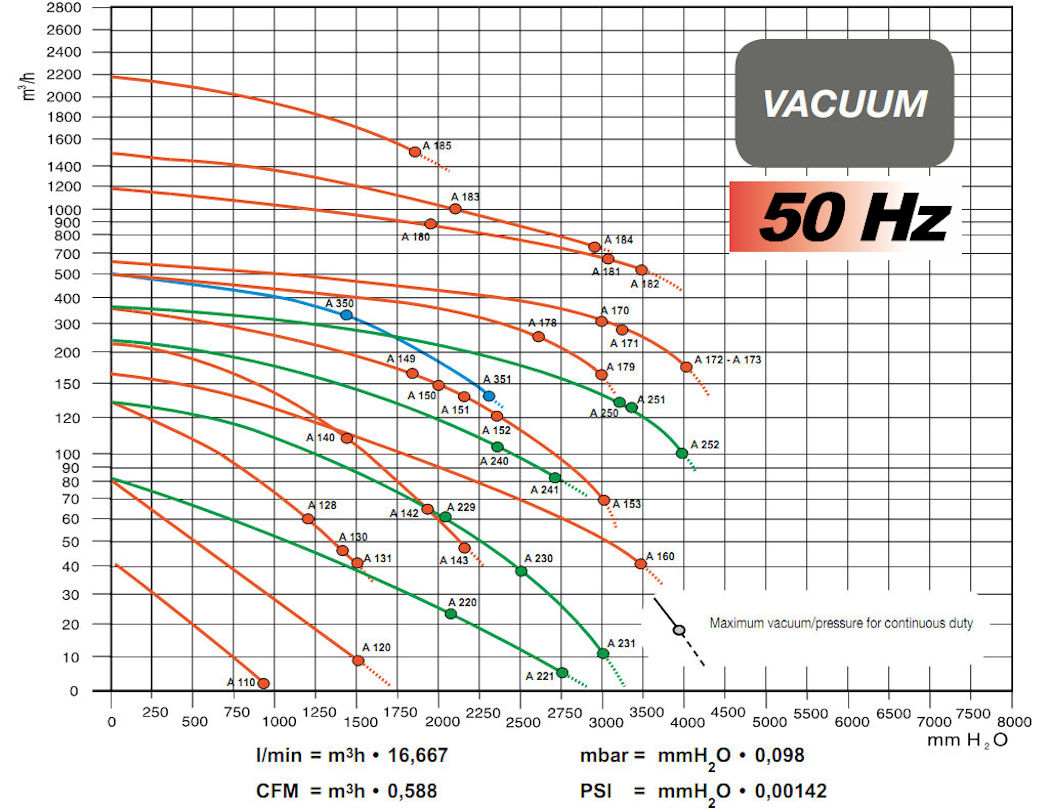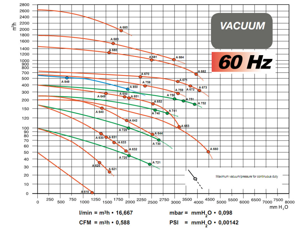 • BVC Side channel blowers/Vacuum Pumps are available in a wide range of sizes with air flows up to 2200 m3/h. Pressure from 250mmH20 (.3PSI) to 5500mmH20 (7.5PSI)