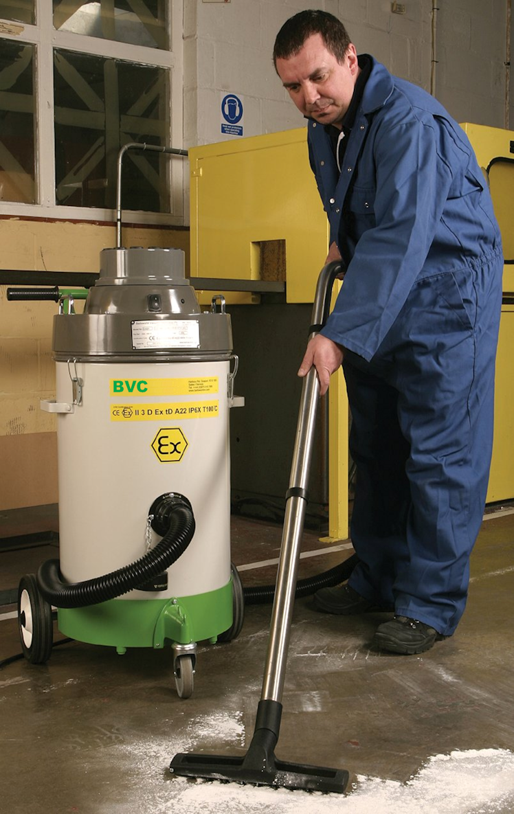 The ATEXD22 versions of the BVC IV40 are suitable for ATEX ZONE 22 rated areas. These units differ from the other models in the IV40 range in that they use a brushless motor design, eliminating spark risk, complemented by ATEX rated components. The separated cooling air for the motor is protected by HEPA filters in the head of the machine on both the inlet and outlet side of the motor. Main filtration is 3 stage; firstly a disposable microfibre bag, followed by an ATEX rated needlefelt main filter complemented by the third stage HEPA working air filter.