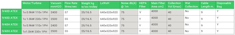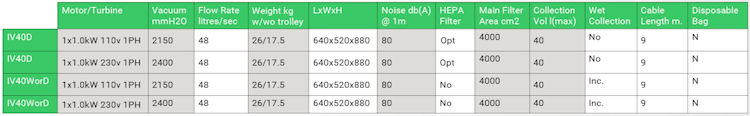 All units are fitted with a large HEPA filter. The M-Class units are designed for all duties where an M-Class is specified. The H-Class units in addition are supplied with DOP test certification. The IV40DM and IV40DH are designed to be used with the conductive hose and tool sets. All units are available with or without the optional trolley. Both 110v and 230v units are available.